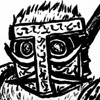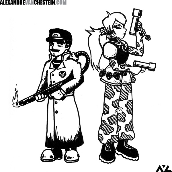 The piece was drawn using markers at different stages of wear depending on the texture effects needed. The result was then scanned into Photoshop to add texturing and color to the protagonist's ragged shirt. Finally, a Protoman logo was drawn separately and added as a worn design on the piece of clothing. |