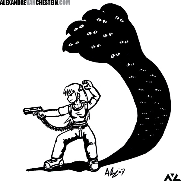 Tout a commencé avec un dessin au crayon de plomb qui fut ensuite numérisé et travaillé dans Photoshop. Des couleurs principales ont été ajoutées au personnage, ainsi qu'un jeu d'ombrages tenant compte de la lumière provenant du plancher. Les effets de lumières colorées furent ajoutées ensuite, créées de toute pièce dans le programme. Les réflections de lumières ont suivi, le tout se terminant avec un léger effet de filtre pour ajouter le brouillard. |